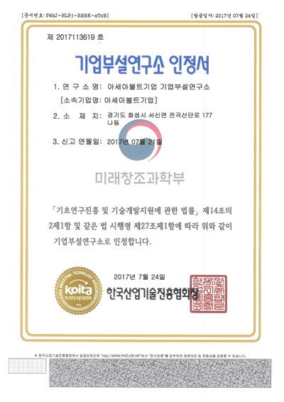 기업부설연구소 인정서 페이지 정보 작성자 아세아볼트 작성일18-01-04 00:19 조회1,786회 댓글0건 관련링크 이전글 다음글 목록 본문 기업부설연구소 인정서 이전글 다음글 목록
